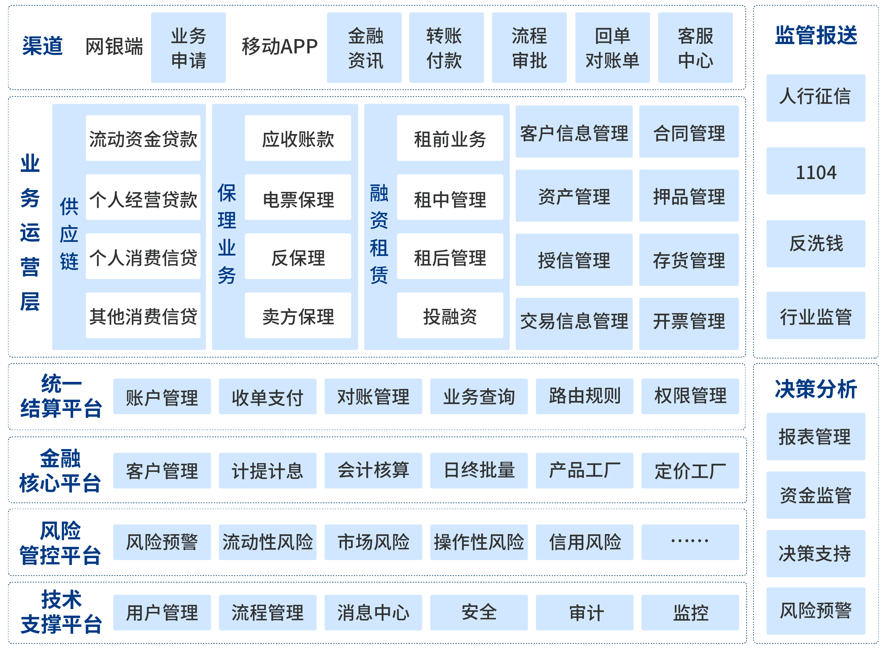 聚焦金控公司業(yè)務(wù)運(yùn)營、資源管理、金融服務(wù)能力輸出的特點(diǎn),解決營銷管理、混業(yè)經(jīng)營、多元化金融服務(wù)、全能監(jiān)管等問題,提供各金融單元業(yè)務(wù)的全流程運(yùn)營管理和集中統(tǒng)一的客戶體系、賬戶體系、金融產(chǎn)品及定價模型,全方位的支撐金控平臺管理要求及業(yè)務(wù)發(fā)展創(chuàng)新。