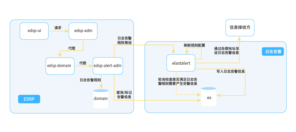 ● 日志告警:通過管控端配置告警規(guī)則提交到告警管理模塊落庫持久化,同時將告警規(guī)則推送至日志告警組件,然后刷新本地告警規(guī)則配置并定時輪詢檢測日志數(shù)據(jù)是否觸發(fā)告警規(guī)則,隨后產生相關告警事件,并將告警事件持久化,同時推送至告警推送系統(tǒng)進行下一步推送操作。