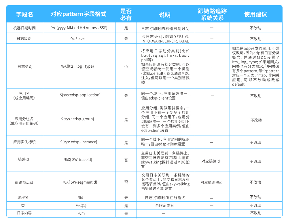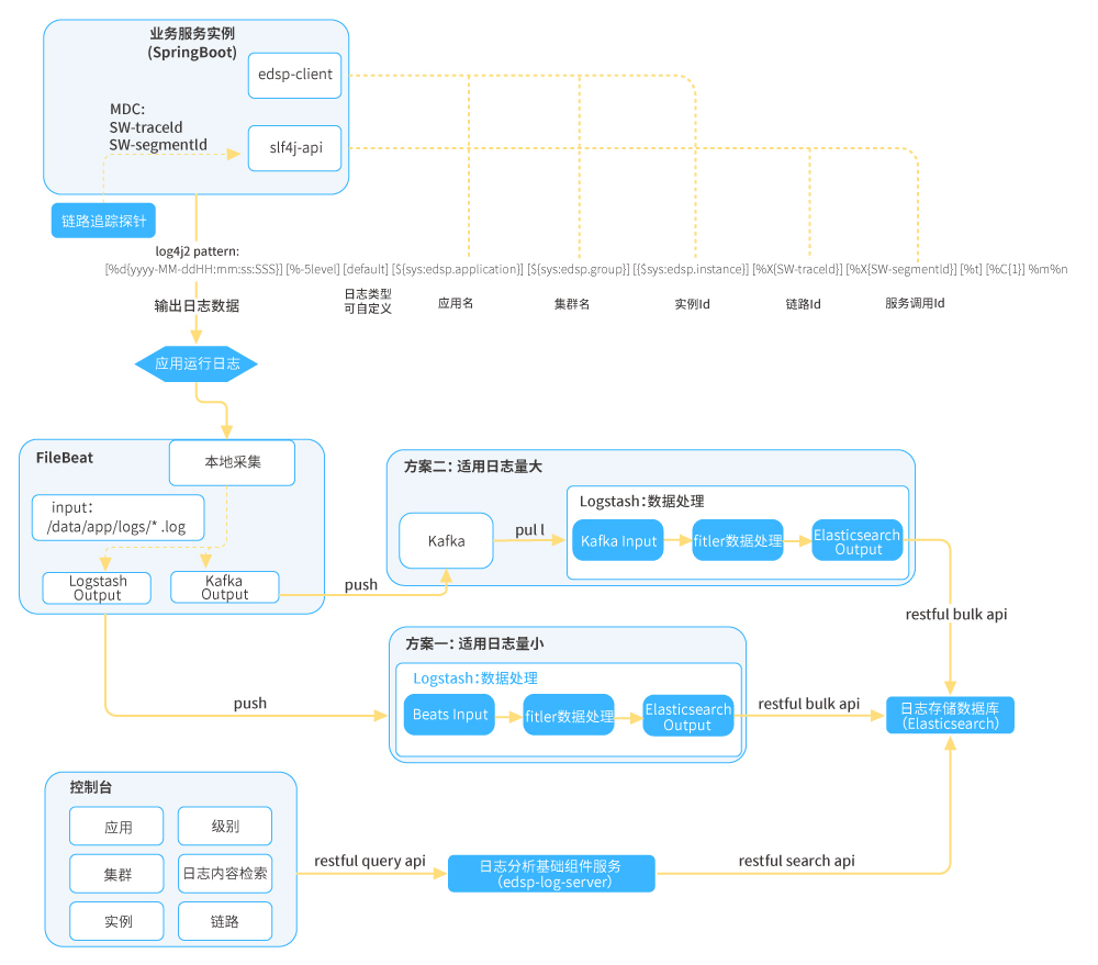 ● 應用日志分析:在日志收集和分析領域EFK是普遍采用的技術方案,但在應用日志分析的落地使用上,應用日志規(guī)范才是其核心的價值體系,對于企業(yè)級微服務日志觀測方面,日志規(guī)范體系需要在日志組件上落地以此作強規(guī)范約束;將規(guī)范中的某些關鍵數(shù)據(jù)以MDC方式注入,并按標準輸出到日志文件,日志收集組件到指定路徑收集日志數(shù)據(jù)推送至日志分析組件,日志分析組件按規(guī)范解析日志數(shù)據(jù)并進行持久化;平臺通過日志分析服務獲取日志數(shù)據(jù)。