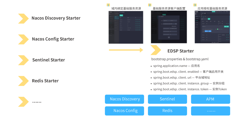 ■ 將業(yè)務應用集成這些基礎組件所需要的各種客戶端Starter包裝成一個簡單且統(tǒng)一的客戶端Starter,利用Spring Boot內置的監(jiān)聽器機制,在業(yè)務應用啟動時可以連接到平臺上以此來獲取連接這些組件資源所需要的各種參數(shù),在這個過程中也可以通過Token機制實現(xiàn)對組件資源的訪問權限控制,即降低了業(yè)務應用集成這些基礎組件的配置參數(shù)管理難度,也提高了對基礎組件使用的安全管控能力。