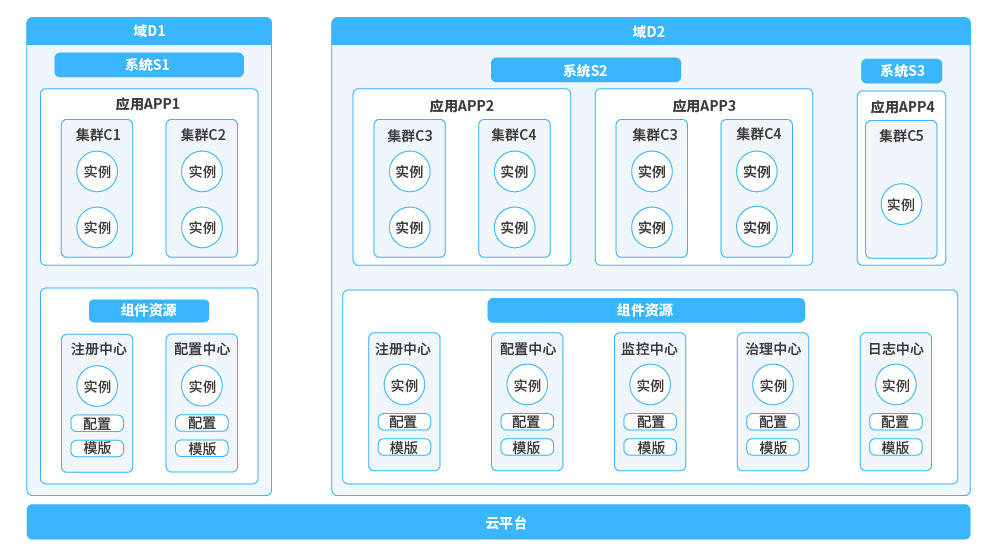 提供一套圍繞業(yè)務應用和基礎組件的管理體系。在業(yè)務應用管理方面,提供從域、系統(tǒng)、分區(qū)、應用和單元(集群)等多維度管理方案,進而細粒度的控制業(yè)務應用接入;在基礎組件管理方面,可以對組件資源進行統(tǒng)一管理,做到應用零配置化即可使用組件。
