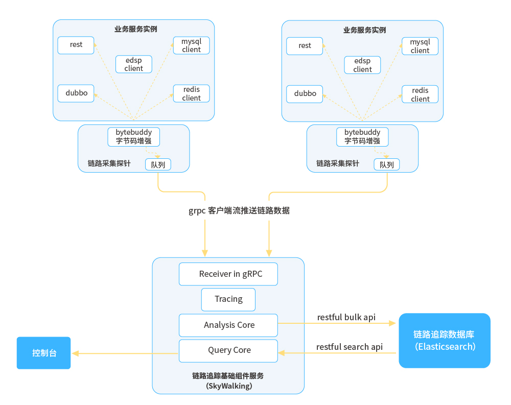● 鏈路追蹤:與性能監(jiān)控探針技術類似,利用Java探針技術,遵循OpenTracing標準,收集全鏈路數(shù)據(jù),并分析鏈路數(shù)據(jù)形成調用拓撲;應用實例通過平臺SDK注冊到平臺獲取到APM組件信息,通過APM組件客戶端對APM組件進行相關初始化操作,之后依托Agent字節(jié)碼增強技術在相應位置進行埋點,定時將鏈路數(shù)據(jù)推送至APM組件進行分析并持久化,同時將MDC信息填充到日志,從而實現(xiàn)鏈路與日志的聯(lián)動;平臺本身通過訪問APM組件暴露的端點獲取相關鏈路數(shù)據(jù)。