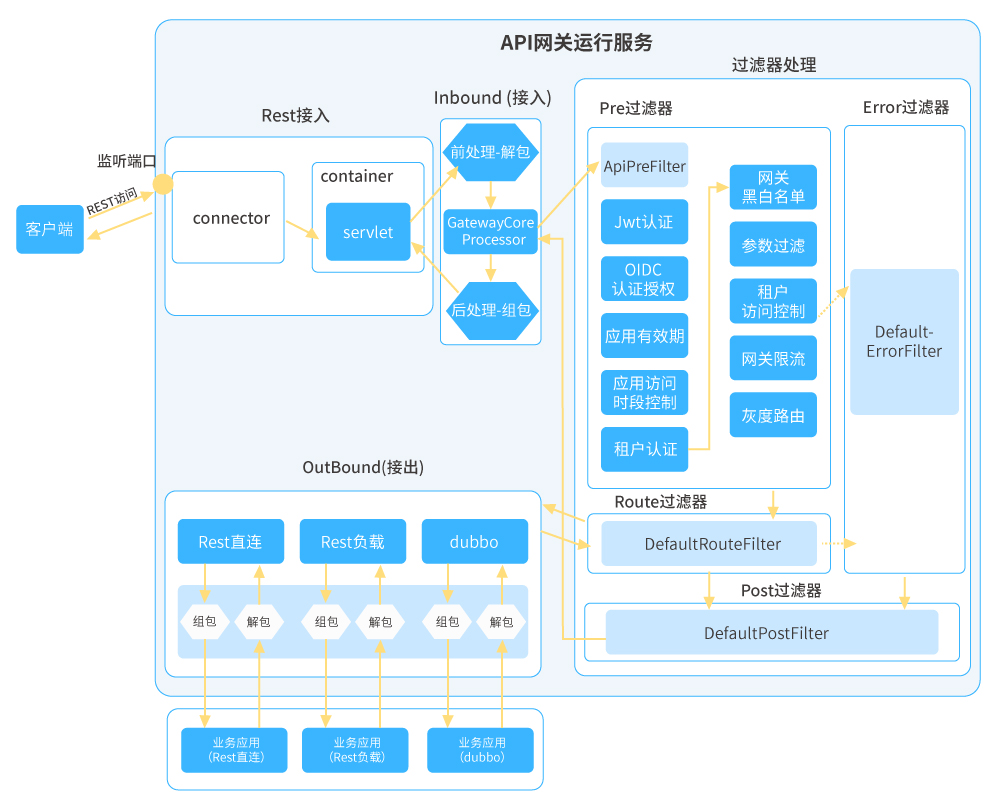 平臺服務網(wǎng)關接收到客戶端接入請求,首先會對報文進行解包成網(wǎng)關內部請求對象,之后走核心過濾器鏈: