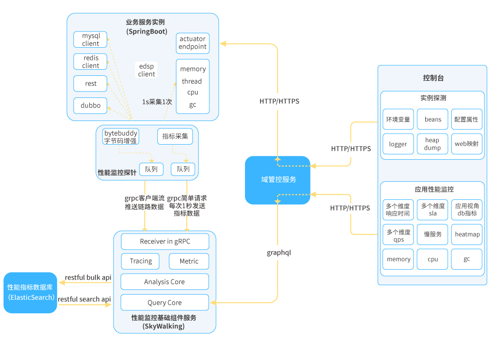 ● 性能監(jiān)控:為了實現(xiàn)對業(yè)務應用的零代碼侵入,可采用Java探針技術實現(xiàn)對微服務應用的性能數(shù)據(jù)采集,如Skywalking APM Agent;從應用、集群、端口等維度收集性能數(shù)據(jù),性能數(shù)據(jù)包括但不局限于:服務可用級別、響應時間、每分鐘調用數(shù)、百分位響應耗時、CPU、內存、GC情況等。應用實例通過平臺SDK注冊到平臺獲取到APM組件信息,通過APM組件客戶端對APM組件進行相關初始化操作,之后依托Agent字節(jié)碼增強技術在相應位置進行埋點,定時將性能數(shù)據(jù)推送至APM組件進行分析并持久化;平臺本身通過訪問APM組件暴露的端點獲取相關性能數(shù)據(jù)。